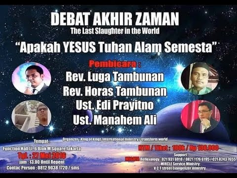 HomeDebat Debat: Apakah Yesus Tuhan Semesta Alam? byAdmin -3:14 PM 0 Debat Akhir Zaman The Last Slaughter In The World "Apakah Yesus Tuhan Semesta Alam?" Pembicara: Rev. Luga Tambunan Rev. Horas Tambunan Ust. Edy Prayitno Ust. Manahem Ali